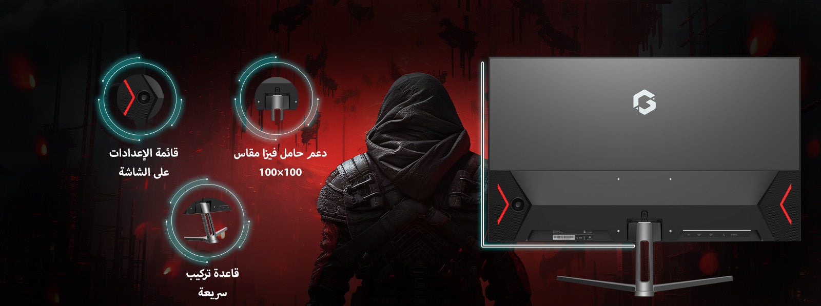 تتميز الشاشة بقاعدة تثبيت سريعة ومع توافقها مع معيار VESA (100x100 مم)، يتمتع المستخدمون بالمرونة في تركيب الشاشة على أذرع أو أقواس تثبيت متوافقة مع معيار VESA.