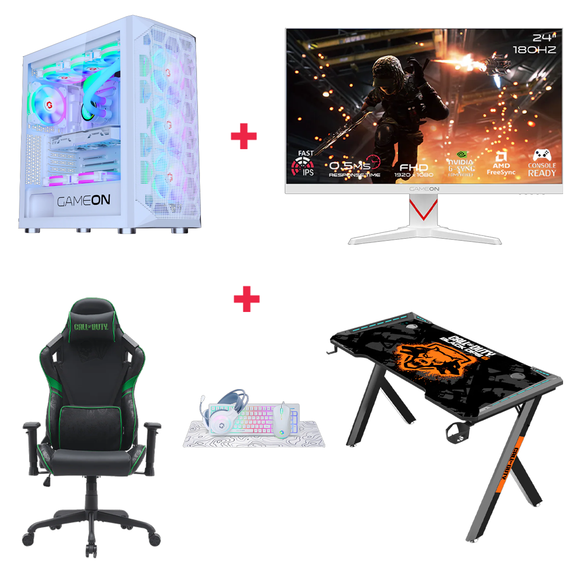 باقة كمبيوتر الألعاب - بروسيسور كور اي 5 14400 اف, رام 16 جيجا بايت, بسعة 1 تيرا بايت, ار تي اكس 3050 6 جيجا بايت, باور سبلاي 650 وات, مع شاشة بحجم 24 بوصة بدقة 180 هرتز مع (كيبورد, سماعة الرأس, ماوس وماوس باد) + كرسي وطاولة الألعاب - أبيض