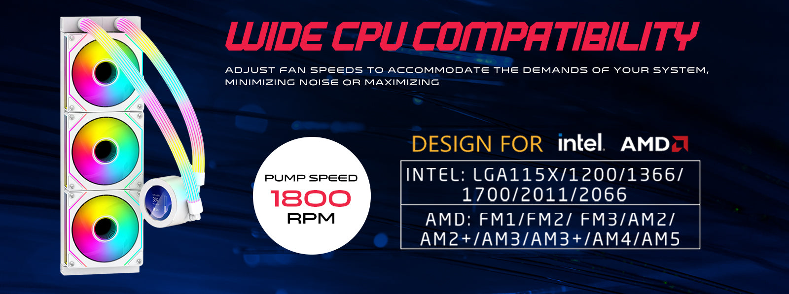 Compatible with Intel (LGA/2011/1366/115X/775) and AMD (AM4/AM3+/AM2+) sockets, making it versatile for a wide range of processors and future upgrades.