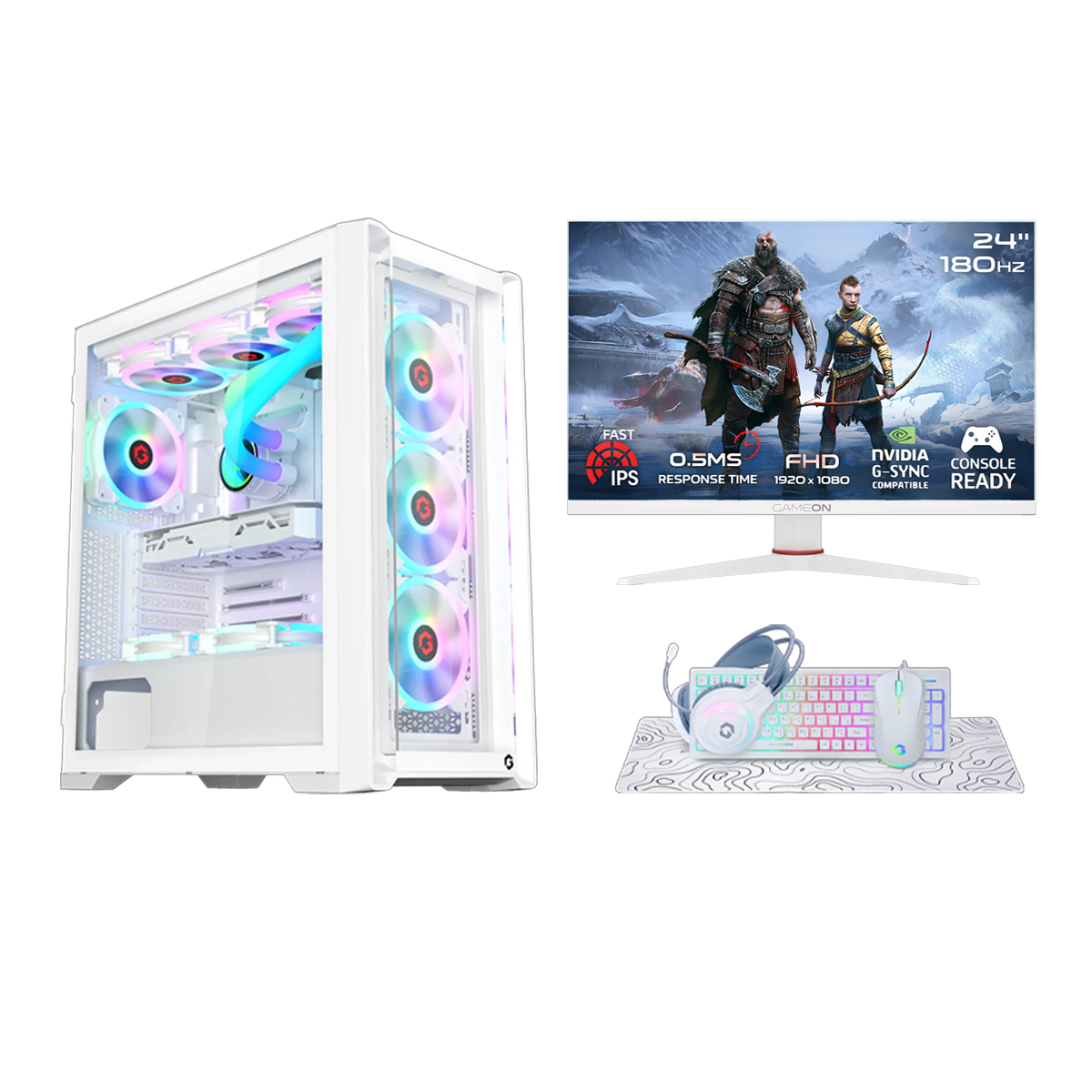 i5 12400F, 16GB RAM, 1TB SSD, RTX 3050 6GB, 650W PSU, Liquid Cooler, 24" FHD 180Hz IPS Monitor & All-in-One Gaming Bundle (Keyboard, Headset, Mouse, Mousepad) - White | Gaming PC Bundle