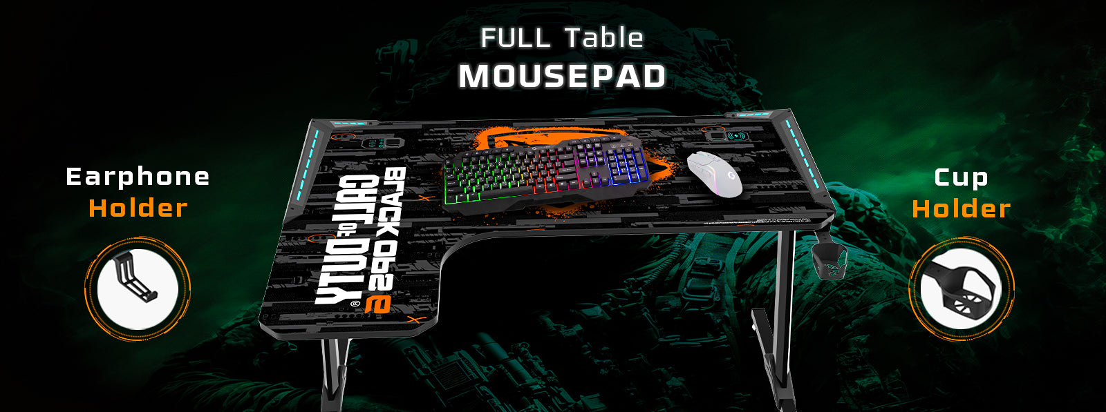 · Spacious Design: Large 120×60/100×72cm surface for all your gaming or work essentials. · RGB Lighting: Adjustable RGB ambient lights for a personalized gaming atmosphere. · Wireless Charging & USB Splitter: Built-in wireless charger and 3 USB ports for seamless device connectivity. · Ergonomic Add-ons: Includes a headset hook, cup holder, and a full-table mouse pad for ultimate convenience. · Cable Management: Smart system to keep your workspace tidy and organized.