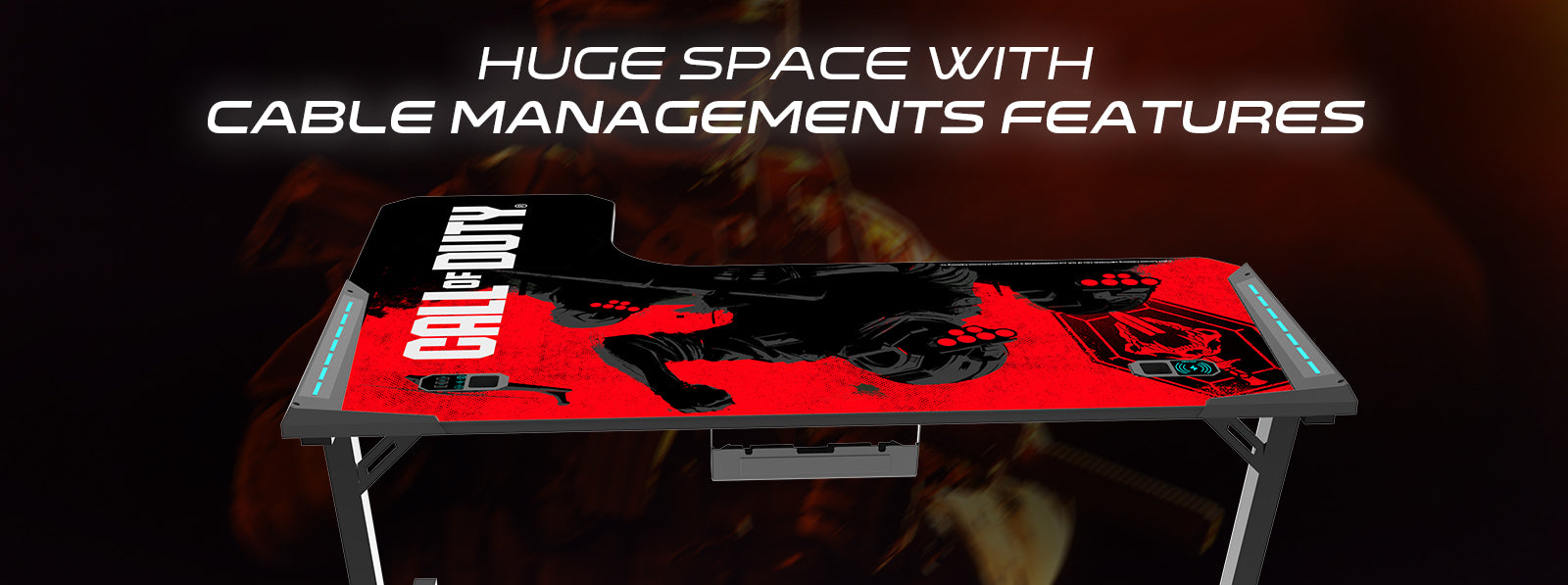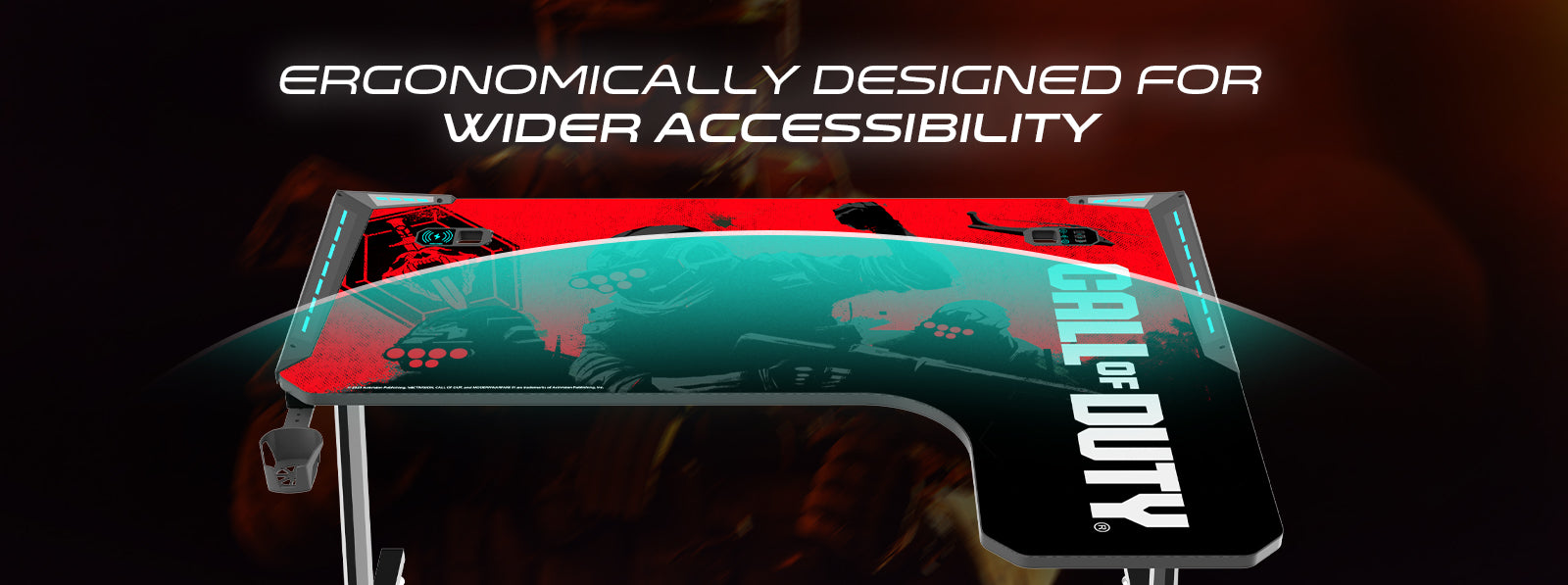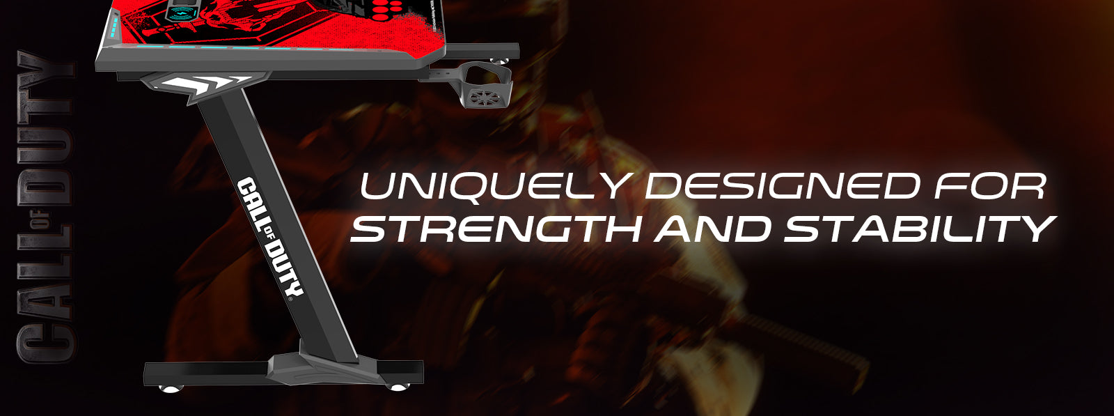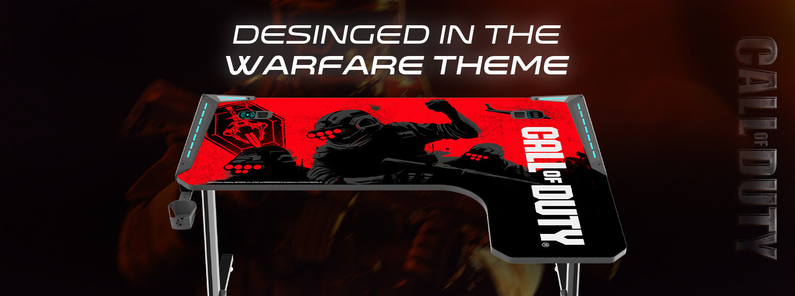 This Call of Duty themed desk is specially designed to provide more space to store your equipment and allows a better posture for you. The cup holder and headphone hook keep your drinks and headphones right at your fingertips.