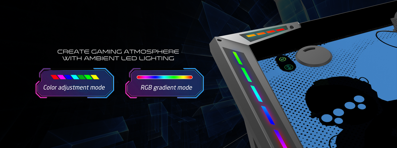 Seamlessly integrated into the desk's sleek design, the RGB lighting adds an electrifying ambiance to your gaming setup, casting a mesmerizing glow that enhances immersion. With customizable colors and dynamic lighting effects, you can personalize your gaming environment to suit your mood or match the aesthetic of your favorite games.