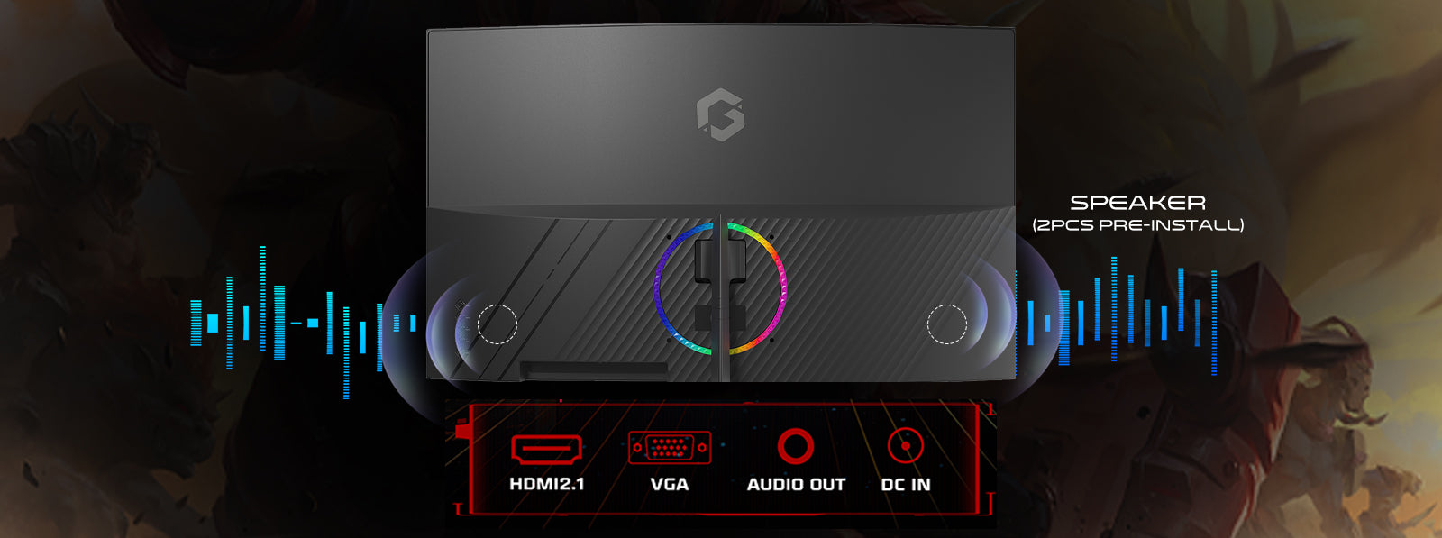 Features HDMI 2.1, DP 1.4, USB, and audio out plus built-in speakers for convenience.