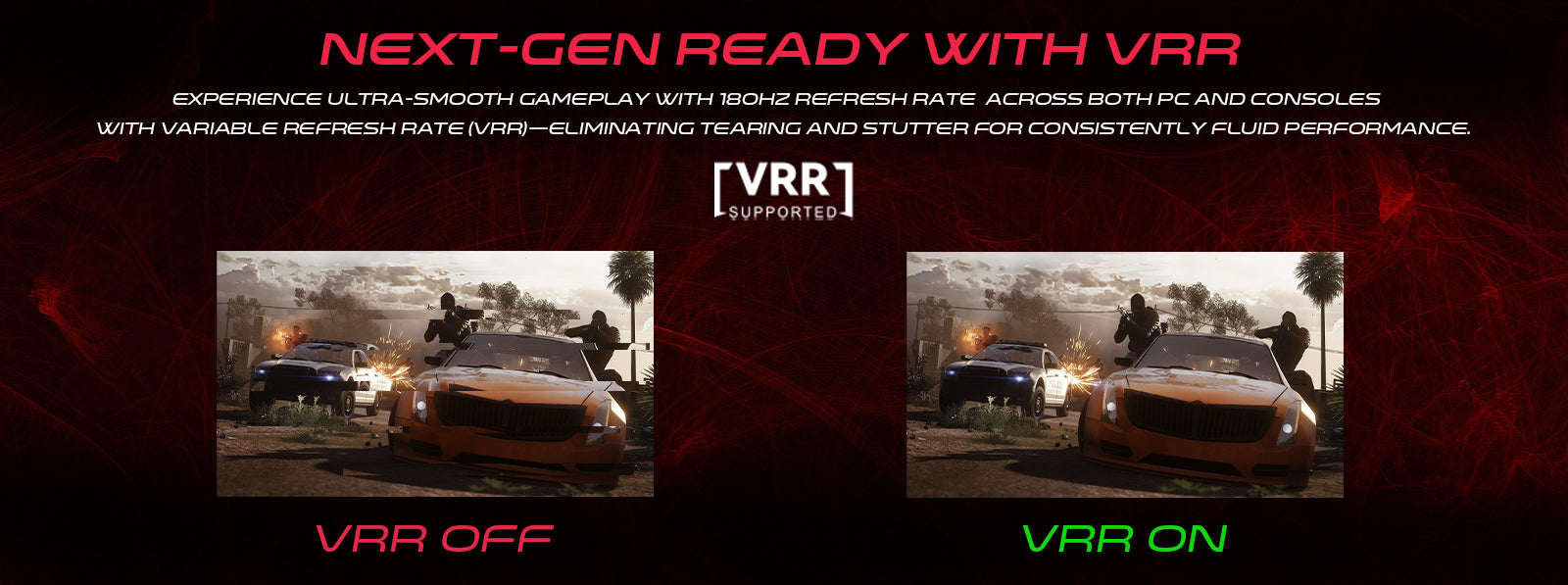 The Gameon GOMM24FHD180IPS comes equipped with full VRR (Variable Refresh Rate) support, ensuring ultra-smooth visuals by dynamically syncing the monitor’s refresh rate with your GPU’s frame output. Whether you’re using FreeSync or G-Sync, you’ll enjoy stutter-free, tear-free gameplay—especially in graphically intense scenes.