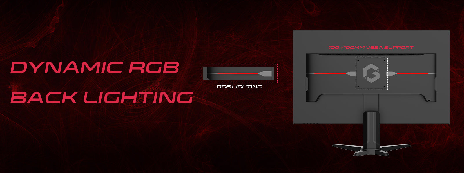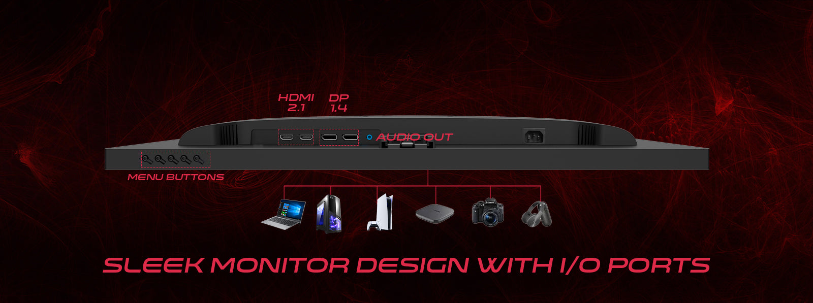Sleek and sharp in matte black with red accents, this monitor features an ergonomic 5° forward / 15° backward tilt, a VESA mount (100x100mm) for wall or arm setups, and stylish rear RGB lighting. Multiple inputs include 2x HDMI 2.1, 2x DP 1.4, and Audio Out, supporting everything from gaming rigs to next-gen consoles.