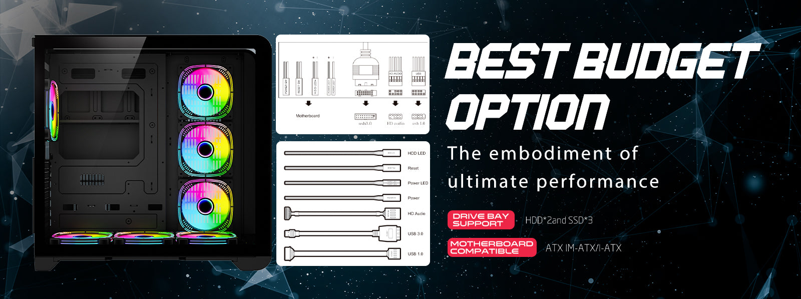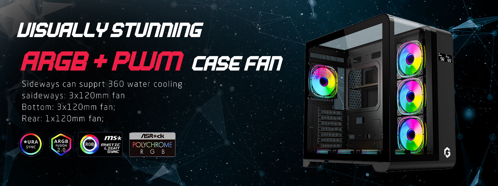 Keep your system running cool with 7 pre-installed ARGB+PWM fans and support for top 360mm water cooling and bottom 3x120mm fans.