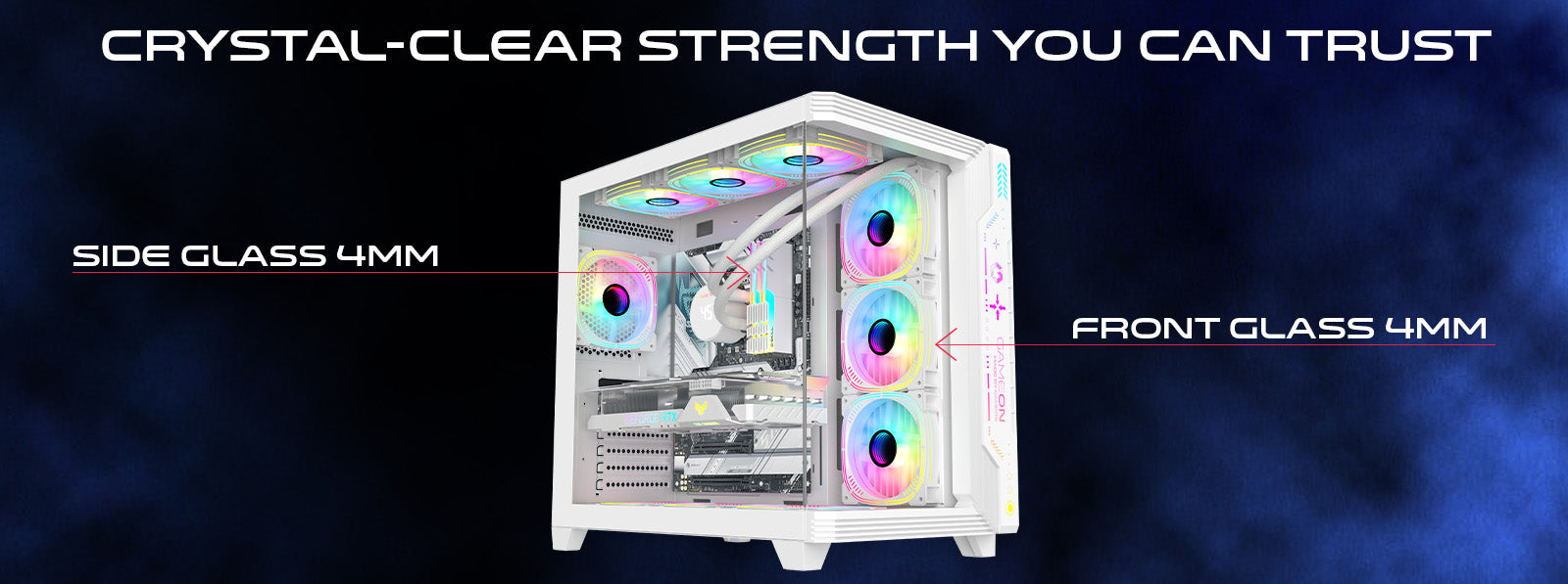 Experience durability without compromising elegance. Our 4mm thick front and side glass panels offer enhanced protection, clear visibility, and a sleek premium look.