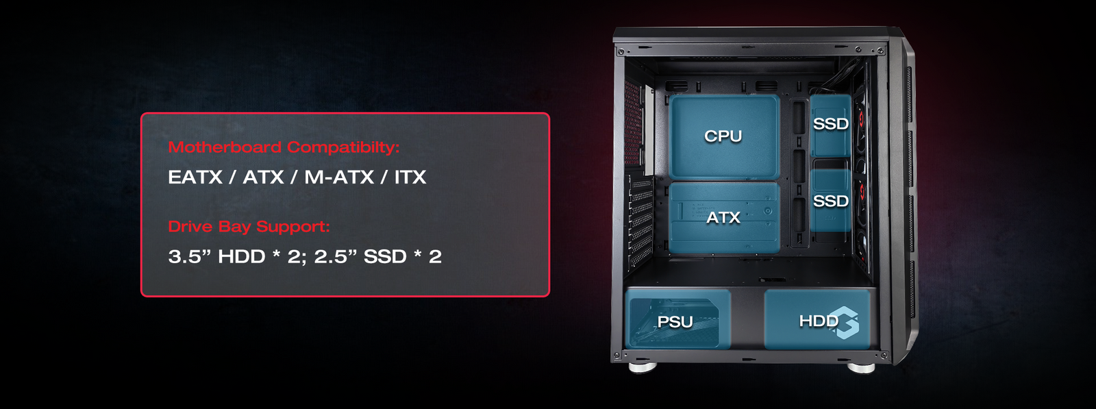 Designed to support ATX motherboard systems, this mid-tower PC case is compatible with a wide range of gaming PC components doesn't matter big or small. he spacious interior fits all off the vital components needed for a beast gaming PC.