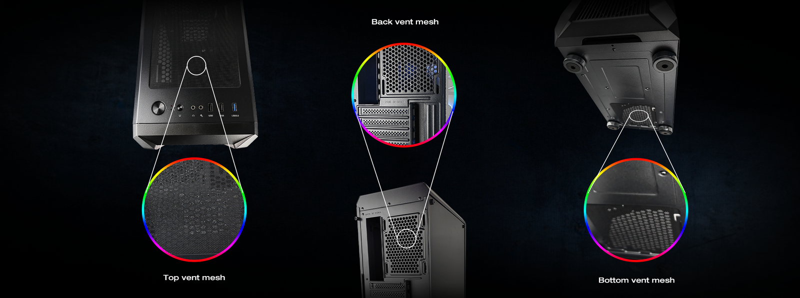 Besides the spacious interior design of this gaming pc case. it has been provided with the Mesh designed for optimal Air Intake to facilitate cooling and hence increasing the efficiency of your PC.