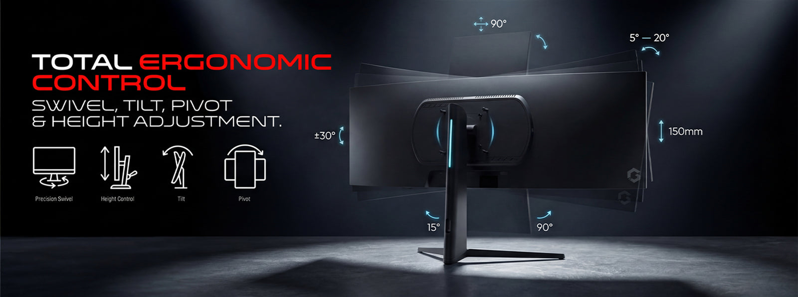 Game longer in total comfort. Featuring height adjustment (150mm), swivel, tilt, and VESA support, designed for the perfect viewing position.