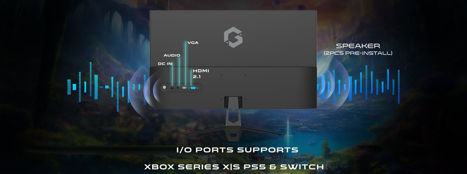 Equipped with a range of connectivity ports including VGA, HDMI 2.1, Audio out, and DC 12V 3A, this monitor offers versatile connectivity options. Users can easily connect various devices such as computers, gaming consoles, and audio equipment for seamless integration and enhanced usability.